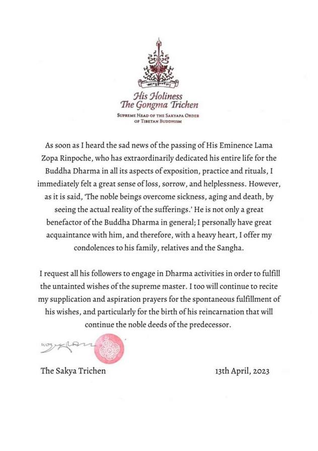 Его Святейшество Сакья Гонгма Тричен Ринпоче выразил соболезнования в связи с уходом из жизни Ламы Сопы Ринпоче