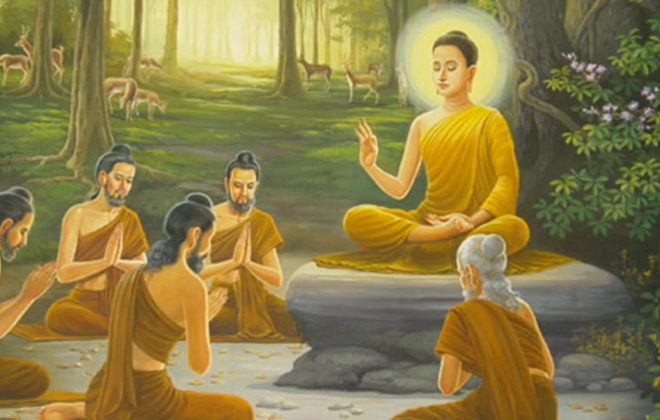 По достижении просветления под деревом бодхи в районе нынешнего города Бодхгая, Будда Шакьямуни длительное время оставался в безмолвии и первое учение было изложено по просьбе Брахмы и Индры, обратившимся к Будде с просьбой поделиться своими драгоценными познаниями с этим миром. Учение было даровано его первым ученикам и последователям в оленьем парке в Сарнатхе, близ Варанаси, куда пришел из Бодхгаи Просветленный.