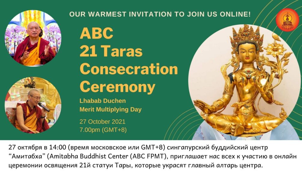 27 октября в 14:00 онлайн церемония освящения статуй 21 Тары с Кьябдже Ламой Сопой Ринпоче и Кхен Ринпоче Геше Чоньи